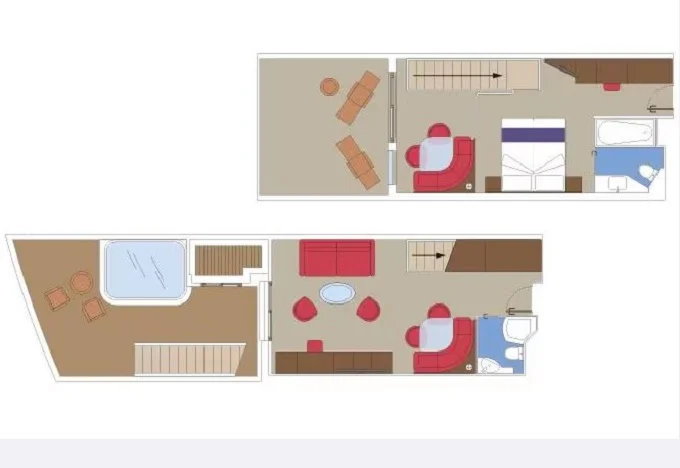 | YJD - Yacht Club Duplex Suite s vírivkou 46 m² + balkón 28-31 m². Vírivka. 2 podlažia, šatník, 2 kúpeľne (1 s vaňou). Max 4 osoby. 16. paluba. Cenový model MSC Yacht Club. | 9 271 € 9 271 € za osobu | ||