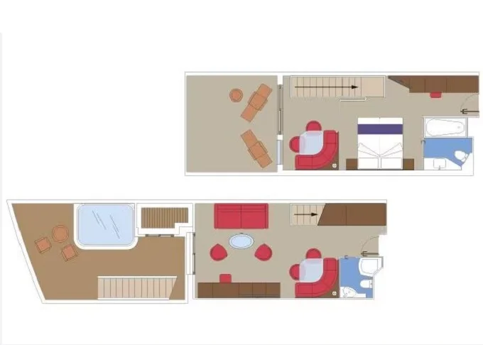 | YJD - Yacht Club Duplex Suite s vírivkou 46 m² + balkón 28-31 m². Vírivka. 2 podlažia, šatník, 2 kúpeľne (1 s vaňou). Max 4 osoby. 16. paluba. Cenový model MSC Yacht Club. | 16 488 € 4 122 € za osobu | ||
